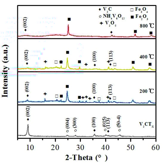 Figure 1 shows the XRD spectrum of V2CTx MXene pre-intercalated with Fe species with different annealing temperatures. The diffraction peaks of the etched sample are completely different from those of V2AlC (JCPDS No. 29-0101). They mainly consist of two sets of diffraction peaks. Among them, the characteristic peaks at 2θ = 9.0°, 35.6° and 41.2° correspond to the (002), (100) and (113) crystal planes of V2CTx, respectively [36], indicating that V2CTx MXene has been successfully prepared by the selective etching of V2AlC. The positions of the remaining diffraction peaks are consistent with those of NaV6O15 (JCPDS No. 77-0146) [36]. Since there is no sodium element in the raw materials used in the experimental reaction, and considering the presence of ammonium fluoride in the raw materials, it can be inferred that the position of sodium element in the product structure is replaced by ammonium ions, and the ammonium ions are located at the position where sodium ions are in the structure of this standard card. This may be attributed to the fact that the V2C dispersion formed after the etching reaction of the raw material V2AlC undergoes a partial hydrothermal reaction under the condition of an appropriate amount of dilute hydrochloric acid, causing V2C to be oxidized to generate a small amount of HV6O15, which then undergoes an ion exchange reaction with the ammonium ions present in the reaction solution, ultimately forming NH4V6O15. The samples annealed at high temperatures of 200, 400 and 800 °C all retain the (002) characteristic peak, indicating that the pre-embedding of Fe species controlled by annealing does not induce changes in the crystal structure of V2CTx MXene [37].