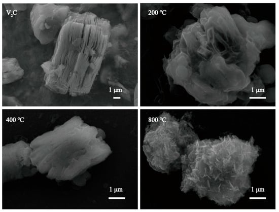 At the same time, it can be observed that the (002) diffraction peak gradually shifts to low angles with increasing temperature. The interlayer spacings of each sample calculated by the Bragg equation (2dsinθ = nλ) are as follows: 9.6044 Å (original V2CTx MXene), 9.8096 Å (200 °C), 9.8324 Å (400 °C), and 10.8589 Å (800 °C). A detailed data comparison can be seen in Table 1. Through comparison, it can be seen that the higher the annealing temperature, the larger the interlayer spacing. This result is contrary to the variation in the interlayer spacing of Ti3C2Tx MXene with annealing temperature reported in the literature [38]. It is worth noting that for the sample annealed at 800 °C, the full width at half maximum (FWHM) of the (002) characteristic peak increases, the intensity decreases significantly, and the peak becomes very flat, indicating that the order degree of MXene has been severely reduced. This is mainly because the excessively high heat treatment temperature destroys the two-dimensional nanolayered structure of MXene, causing severe collapse. This result can be confirmed by the morphology reflected in the SEM micrographs. This indicates that only an appropriate annealing temperature can ensure the integrity of the MXene nanolayered structure.