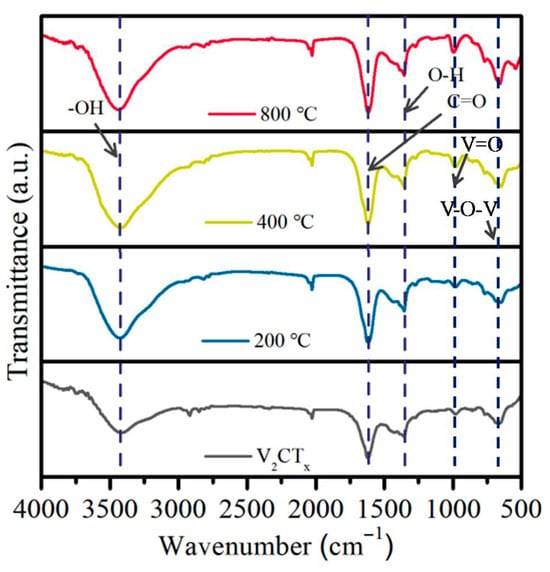 Figure 3 shows the FTIR spectra of V2CTx MXenes pre-intercalated with Fe species with different annealing temperatures. As can be seen from the figure, characteristic peaks appear at 3422, 1624, 1346, 985, and 705 cm−1, corresponding to the -OH, C=O, O-H, V=O, and V-O-V functional groups, respectively. It can be observed that the -OH functional groups at 3422 cm−1 increase with the rise in temperature, reaching the maximum at 400 °C. This may be attributed to the high-temperature embedding of Fe species. However, the -OH functional groups decrease at 800 °C, which is probably due to the re-reaction of O and H in the sample to generate H2 at 800 °C, leading to the reduction of -OH functional groups. The O-H functional groups at 1346 cm−1 decrease with the increase in annealing temperature, because high-temperature calcination treatment results in the formation of more oxygen-containing functional groups. The presence of -O functional groups is more conducive to the excellent intercalation pseudocapacitive performance of V2CTₓ MXene electrodes. In addition, during the annealing process, the surface of MXene sheets is oxidized, forming V2O5, Fe2O3, and Fe3O4 nanoparticles, which increases the proportion of surface oxygen-containing functional groups. This can also be confirmed by the increase in V=O and V-O-V functional groups with the rise in annealing temperature. According to relevant reports, most of the metal cations inserted between V2CTx layers are connected with V-O bonds [41,42]. It can be inferred that in this experiment, after Fe ions are intercalated, a certain degree of V-O-Fe is formed through the interaction with V-O. Moreover, Fe3+ has a stronger interaction with V-O than Fe2+ and is more easily oxidized by the oxygen-containing functional groups on the surface of V2CTx. Since the electronegativity of Fe is greater than that of V, the electron cloud density of V-O bonds decreases, and the binding energy increases. As a result, the content of oxygen functional groups in V2CTx increases significantly. Compared with -F and -OH functional groups, the =O functional group has higher energy, causes the least hindrance during ion transport, and can provide stable electrochemical active sites. Moreover, as an important adsorption site for lithium ions, oxygen functional groups will be beneficial to the lithium-ion storage of V2CTx MXene electrodes [43].