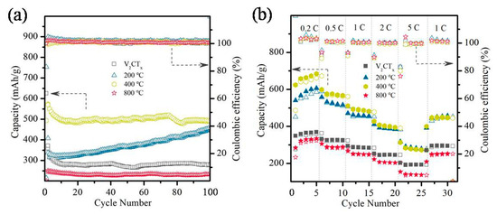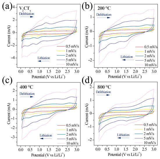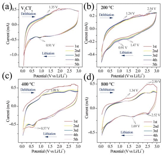 Figure 4 shows the CV curve of the first five cycles of V2CTx MXene electrodes pre-intercalated with Fe species with different annealing temperatures. It can be seen from the CV curves that there is a slight difference between the CV curve of the first cycle and those of other cycles. This is because irreversible reactions occur during the insertion and extraction of lithium ions in the first charge–discharge process of the battery, resulting in the formation of a solid electrolyte interphase (SEI film). The CV curves from the second to the fifth cycles basically overlap, indicating that the insertion and extraction processes of lithium ions inside the electrode material are reversible. All electrodes exhibit CV curves similar to rectangles, and at the same time, all CV curves have redox peaks. This indicates that NH4V6O15 in the initial MXene, as well as V2O5, Fe2O5, and Fe3O4 generated by high-temperature annealing, are all involved in the charge–discharge reaction. It can be inferred from this that the storage mechanism of the V2CTx MXene electrode is the synergistic effect of two mechanisms: ion intercalation and surface redox [44]. The oxidation peaks appear between 1 and 2.5 V, and the reduction peaks appear between 0.5 and 1.7 V. The symmetric CV curves indicate that the Li+ insertion and extraction reactions are reversible. In addition, from the V2CTx MXene, 200 and 400 °C samples in the figure, it can be seen that the reduction peaks appearing at low potentials gradually decrease with the increase in temperature, indicating that the rate of charge transfer kinetics becomes faster, which promotes the insertion/extraction of lithium ions. However, the reduction peak of the 800 °C sample shifts significantly to the right, which may be due to the layered structural damage caused due to the high temperature of 800 °C, thus leading to a decrease in lithium-ion transfer kinetics.