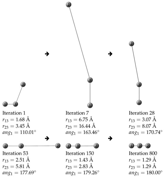 1 of 3 atoms () as a function of iterations number (1, 7, 28, 53, 150, and 800) during its geometric optimization via the PSO algorithm.