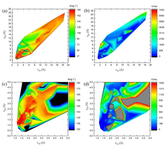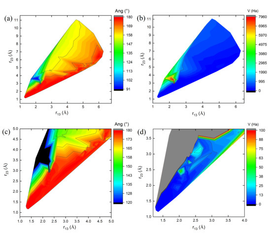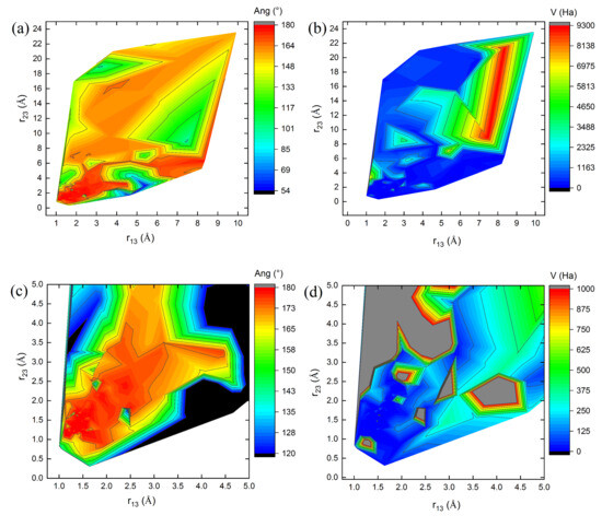 Maps of: (a) Angles Ang (°), (b) potential energy V (Ha), (c,d) magnifications near 5 Å of maps (a) and (b), respectively, as a function of bond lengths