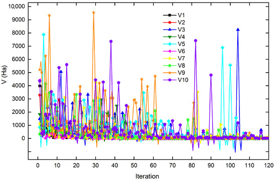 8 and 10 (Figure 2c–f and Table 5). Notably, within the swarm of 10 clusters, each conformation exhibits distinct dynamics, geometric configurations, and energy profiles during optimization via the PSO algorithm (see Figure 2, Figure 3, Figure 4, Figure 5 and Figure 6 and Table 5).