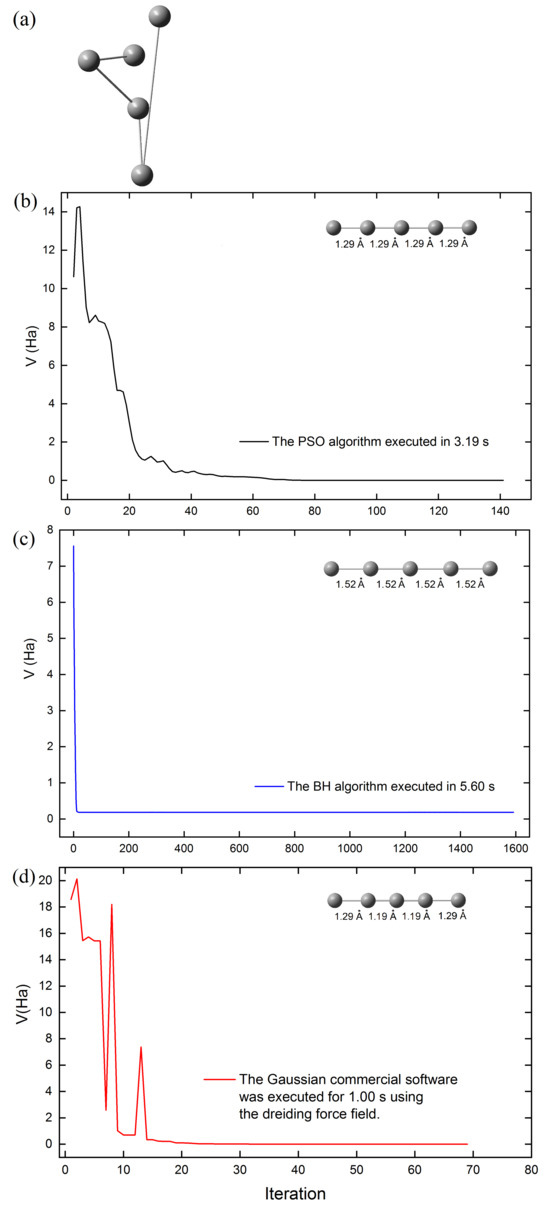 Tables S1–S4 of the supplementary material present the initial structures of the conformers of 10 clusters (swarms) of three-, four-, and five-carbon atoms, from which Jana et al. initiated their study of the PSO algorithm [46]. Using structures optimized with the commercial software Gaussian 09 as a reference, we observed that our results with PSO and BH showed good agreement with the conformations of the optimized structures reported by Jana et al. [46], for carbon clusters of 3–5 atoms (