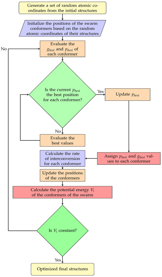 One of the methods that is receiving the most attention in the optimization of molecular structures is the Particle Swarm Optimization (PSO) [28]. The algorithm is based on circumstances similar to the movement of a school of fish, a swarm of bees, or a flock of birds in motion by adjusting their positions and velocities. In general, a colony of animals, apparently without a leader, will change their speeds randomly in search of food, following the group member closest to the food source (possible solution). The group of animals optimizes its positions by following the members that have already reached a better orientation. This exploration process is repeated until the best position within the group is obtained, which is considered to be the position vector in the search space, and the velocity vector regulates the subsequent distribution or movement of the particles. The PSO method adjusts or updates the position and velocity of each particle at each step until achieving the best position experienced by the collective or swarm [29,30].