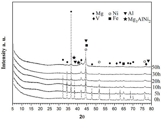 In Figure 1, X-ray diffraction patterns of the alloy are presented after 0, 5, 10, 20, 30, and 50 h of ball milling. Gradual broadening of the diffraction peaks combined with a decrease in the peaks’ intensity and also the disappearance of some of them, especially those of Mg, as well as those related to Al, V, and Fe metals, as a function of grinding time is observed. The ball-milled mixture after 50 h contains a Mg, Ni-type BCC structure and a V BCC-type structure and along with some traces of Mg3AlNi2, which is comparable to the background and starts to appear after 30 h of milling. The Mg2Ni phase is not observed even after 50 h of ball milling treatment.