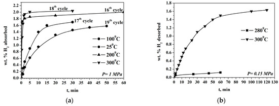The first two cycles of hydrogenation are activation cycles during which slower kinetics and a capacity below 1 wt.% are detected. Usually, the Mg-based materials for hydrogen storage need activation, but the alloy prepared by us is activated relatively fast. The following cycles of hydrogenation/dehydrogenation showed that the Mg50Ni12.5Al12.5V12.5Fe12.5 has a very rapid rate of absorption reaction at 200 and 300 °C with the maximum obtained hydrogen absorption capacity value of 2.04 wt.% H2. The alloy shows similar kinetics of the absorption reaction at both temperatures at the beginning of the process, but the reaction of hydrogen absorption is a bit faster at 200 °C after a very short period of up to 0.5 min. (Figure 2a). After that, with the progress of the absorption process, the rate at 200 °C is slower than at 300 °C. On the other hand, even at room temperature, the absorption capacity is quite high and around 1.6 wt.% H2. In fact, more than 90% of the maximum absorption capacity is obtained after 2 min of hydrogenation at 200 °C and 1 MPa. The alloy is subjected in total to 20 cycles of hydrogenation/ dehydrogenation at different temperatures.