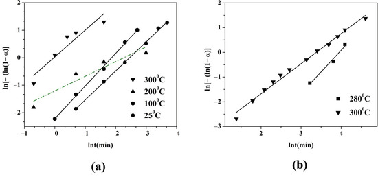 The hydrogen absorption and desorption were analyzed using the Johnson–Mehl- Avrami–Kolmogorov equation (JMAK). The constant n called the Avrami exponent reflects the constancy of the nucleation rate, the dimension of nuclei growth, and the rate controlling step. The Avrami exponent can be determined by the slope of the line described by ln[−ln(1 − α)] = lnt. The fraction of hydrogenation and dehydrogenation at a certain time α was transformed into normalized values (between 0 to 1). Figure 3a,b show the JMAK calculation results of the alloy’s hydrogen absorption and desorption at different temperatures. The R2 values of the JMAK curve fit for hydrogen absorption range from 0.87 to 0.99 and from 0.97 to 0.99 for hydrogen desorption. A good correlation of the fitting results indicates the values of R2 0.99 at 100 °C and 25 °C for hydrogen absorption. The lower value of R2 0.87 for the fits of the two faster absorption processes at higher temperatures at 300 °C and 200 °C has comparatively poor fits. The obtained values for the hydrogen absorption of the Avrami exponent n are 0.5, 0.9, 1.2, and 1 for 200°, 300°, 100°, and 25°, respectively. The fastest hydrogen absorption at the first stage of the reaction is observed at 200 °C, and n at this temperature has the lowest value indicating one dimensional diffusion-controlled growth with a decreasing nucleation rate. For the hydrogen desorption process, the values of the Avrami exponent are increased. The slower hydrogen desorption at 280 °C has a value of n 1.8, and at 300 °C the value is 1.2, indicating nucleation and a two-dimensional growth mechanism for desorption.
