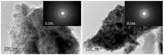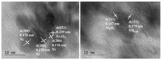 The particles have an irregular shape and are overlapping. Some nanocrystalline areas are observed (Figure 6). The SAED patterns after 50 h of ball milling in Figure 6 are associated with the metals Mg, Ni, Fe, Al, and V. All patterns observed after hydrogenation by SAED in Figure 6 on the right belong to MgH2. In the HTREM image for the 50 h ball-milled sample, the interplanar distance of the lattice fringes of 0.176 nm belongs to the (200) planes of Ni. Another lattice fringe is that of Fe2O3 d (021) = 0.179 nm (Figure 7 left). The right HTREM image in Figure 7 is for the alloy after hydrogenation, and the lattice fringes of 0.167 nm belong to (211) of MgH2 and d (222) = 0.179 nm of VHx. In other obtained SAED results for the alloy after hydrogenation, the patterns of AlFe0.23Ni0.77 alloy and MgO are also observed.