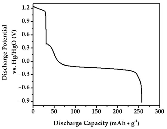 In this study, to optimize the performance of the anode material that we prepared for Ni-MH batteries, determine a safe charge–discharge range, and ensure its stability during this process, an extensive literature review was conducted initially to understand the electrochemical behavior of similar materials [31,32,33,34,35]. The primary aim of this literature review was to identify the potential ranges based on the data obtained to prevent damage to the alloy electrode during overcharging or discharging. Subsequently, the electrochemical stability limits of our alloy electrode were determined at a cutoff potential of −0.9 V using techniques such as Cyclic Voltammetry (CV) through these comprehensive approaches. These methods enable the identification of potential ranges where stable electrochemical reactions occur without triggering undesirable side reactions or electrode degradation. To evaluate the electrochemical characteristics of the Mg50Ni12.5Al12.5V12.5Fe12.5 alloy electrode synthesized through a 50 h ball milling process, galvanostatic and potentiostatic discharge modes were employed. The galvanostatic discharge curve, presented in Figure 8, shows the electrode’s performance when charged at a 1C rate and discharged at a 0.2 C rate, resulting in a maximum discharge capacity of 257 mAh/g.
