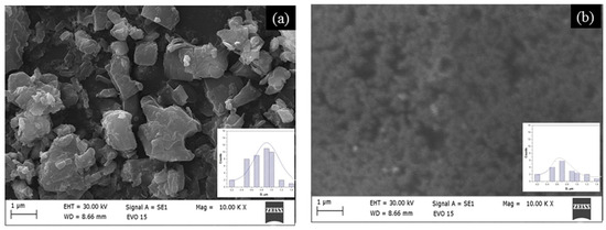 SEM images of hydrothermal (a) and sol–gel (b) ZnO. The insert is the particle size distribution.