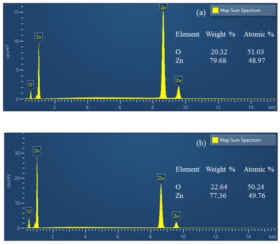 ZnO samples are analyzed using energy-dispersive X-ray spectroscopy (EDS). Hydrothermal and sol–gel ZnO are the two types of tribocatalysts whose atomic percentages of elements are known. There were no additional elemental peaks discovered, confirming the ZnO tribocatalysts’ purity (Figure 2).