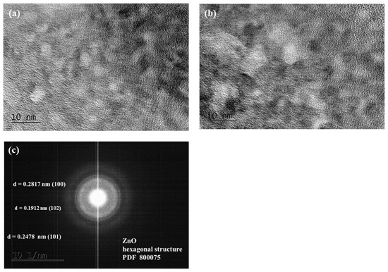 Figure 3 displays TEM images of the hydrothermal and sol–gel ZnO distinct phases. Selected area electron diffraction patterns (SAED, Figure 3c) obtained from TEM images validate the hexagonal wurtzite structure of ZnO and are consistent with the XRD data. The interplanar distances of the crystal lattice of the two varieties of ZnO catalysts (d100–0.2817 nm, d101–0.2478 nm, and d102–0.1807 nm) do not alter, as shown in Figure 3c.