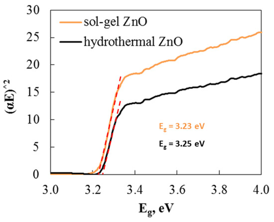 One method commonly used to study the optical properties of materials is UV–visible absorption spectroscopy. Tauc’s equation is used to plot (αE)2 with respect to E and extrapolate as a straight line along the x-axis to determine the bandgap energy values. The values obtained from extrapolation for the ZnO samples’ energy band gap are shown in Figure 5. The band gaps of hydrothermal (3.25 eV) and sol–gel (3.23 eV) ZnO are nearly identical. Therefore, based on these results, there is no difference in the band gap.