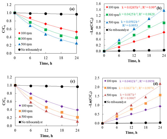 Tribocatalysis of Cefuroxime Axetil using hydrothermal (a,b) and sol–gel (c,d) ZnO at three different stirring speeds with 2.5 cm magnetic rod.
