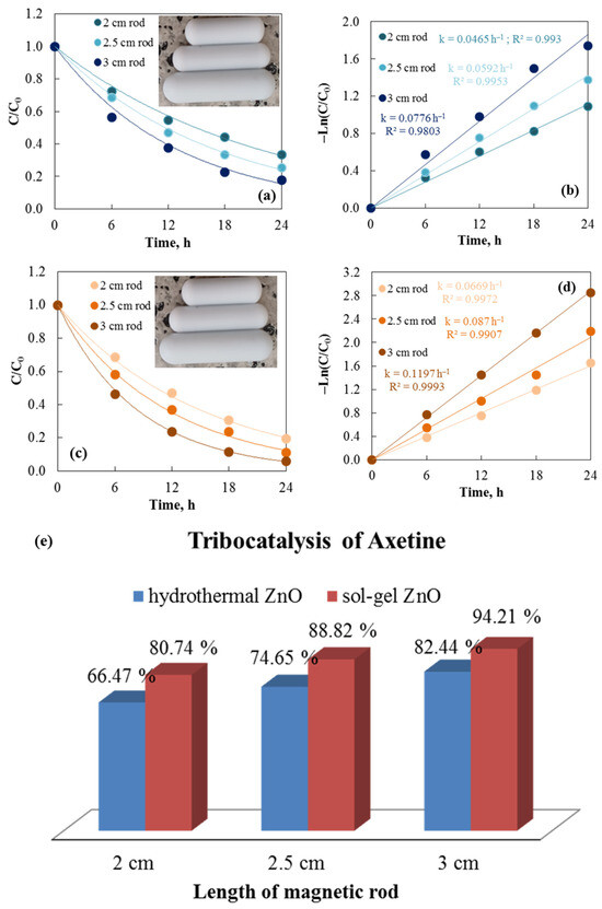 Tribocatalysis of Cefuroxime Axetil at 500 rpm stirring speed using hydrothermal (a,b) and sol–gel (c,d) ZnO with three different lengths of magnetic rods. Degrees of Axetine degradation versus length of magnetic rods (e).