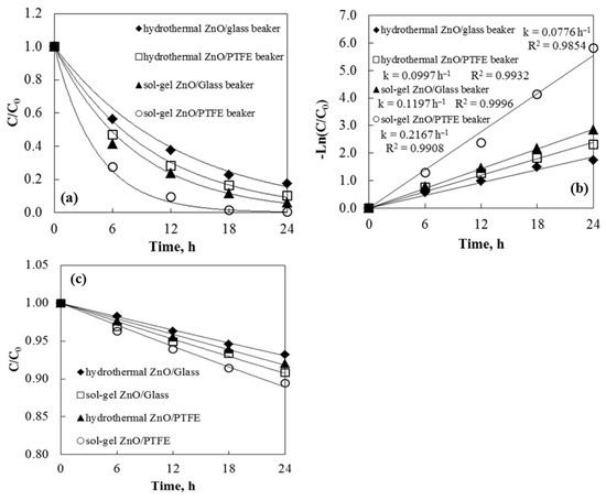 The efficiency of tribocatalysis is greatly affected by electron transfer between the friction pairs. During stirring, electron transfer may occur due to friction between the catalyst and the vessel or between the stirrer and the reactor bottom. Since the vessel significantly influences the tribocatalytic efficiency, the material of the vessel is now considered during tribocatalysis. It was discovered that polytetrafluoroethylene can absorb more electrons than glass during the friction process [34]. Consequently, the catalyst releases more electrons upon contact with the PTFE stirrer and PTFE beaker, resulting in increased tribocatalytic efficiency. To investigate the impact of beaker material on tribocatalysis using ZnO as a catalyst, two different beakers were used. Experimental results showed that the degradation rates of Axetine in the glass and PTFE beakers were 94.2% and 99.7%, respectively, after 24 h of stirring with a PTFE rod (Figure 8). The same trend was observed with hydrothermal tribocatalysts, though with less degradation of the drug. The electron affinity of different materials influences the electron transfer caused by friction [35,36]. A higher tribocatalytic efficiency occurs when the catalyst interacts with the PTFE beaker and stirring rod because PTFE can transfer more electrons during friction than glass. Additionally, a dark phase adsorption experiment was conducted with Axetine in a glass and PTFE beaker in the presence of ZnO tribocatalysts and a 3 cm magnetic rod. In all four cases, the drug concentration decreased by 6–10%. The adsorption data are shown in Figure 8c.