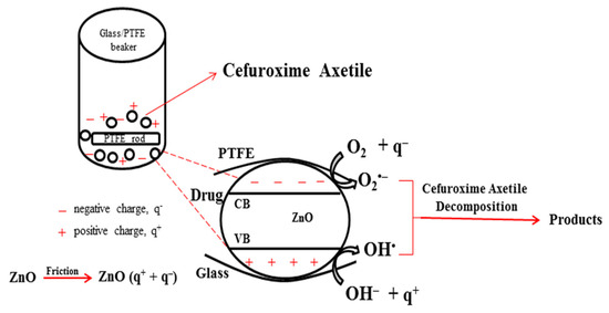 Figure 9 shows a potential tribocatalysis principle diagram. Stirring the ZnO catalysts and applying friction results in the production of positive (q+) and negative (q−) charges on the surfaces of the ZnO powders and the PTFE stirring rod [37]. When ZnO is excited by friction, it produces both positive and negative charges. Like photocatalytic drug decomposition based on photogenerated carriers, Cefuroxime Axetil decomposition can also be accomplished by triboelectrically generated electric charges. Although the positive charges on the ZnO powders’ surface are released into the water, creating active OH• radicals, superoxide radicals (O2•−) are created when oxygen molecules react with negative charges [37,38,39,40]. The antibiotic is further degraded by these radicals into inorganic substances like water and carbon dioxide.