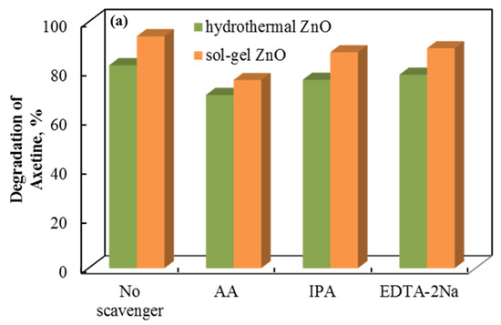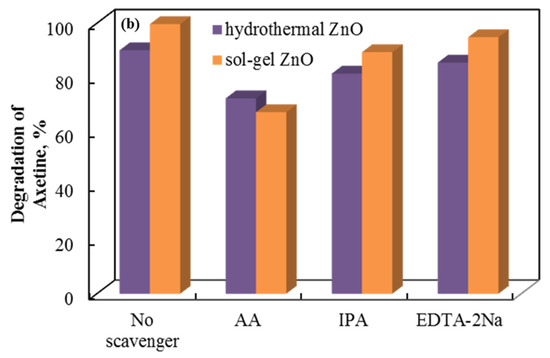 The tribocatalytic properties of ZnO powders are confirmed and contrasted in Figure 7e for the degradation of Axetine dissolved in distilled water using rods of three distinct lengths. The decomposition of the drug with a 2 cm rod is 66.47% and 80.74% using hydrothermal and sol–gel ZnO, while it increases to 74.65 and 88.82%, 82.44 and 94.21%, at 2.5 and 3 cm, respectively. High gravity is created and the catalyst-stirring rod contact surface is improved by the 3 cm stirring rod’s greater mass compared to the 2.5 and 2.0 cm stirring rods [33].