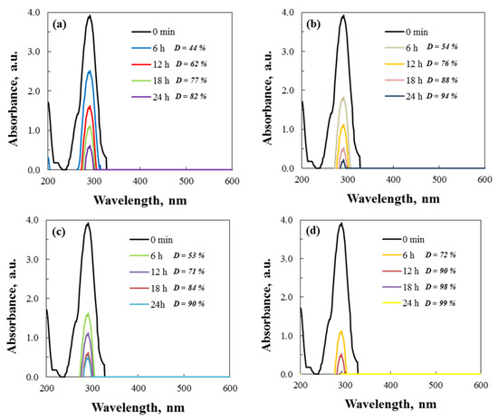 Spectral data for the tribodegradation of Axetine in glass ((a) hydrothermal and (b) sol–gel ZnO) and PTFE ((c) hydrothermal and (d) sol–gel ZnO) beaker.