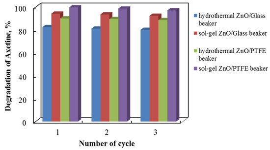 Tribocatalysts used in environmental applications must be able to sustain consistently high tribocatalytic properties over time. Tribocatalytic tests are thus performed to assess the cycling stability of four distinct catalyst types for the degradation of Axetine at 500 rpm. The findings of an investigation into sample regeneration and repurposing are shown in Figure 12, which shows a progressive decline in catalytic quality with each cycle. After three cycles, the tribocatalytic breakdown of Axetine for the hydrothermal ZnO/Glass, sol–gel ZnO/Glass, hydrothermal ZnO/PTFE, and sol–gel ZnO/PTFE catalysts dropped by about 2%. Nonetheless, the nanostructures continued to demonstrate elevated photocatalytic activity following three experimental cycles.