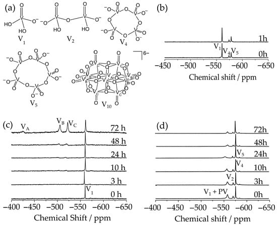 51V NMR spectra recorded at room temperature of 1.0 mM V15 solutions at different times. In (a) structure of the vanadium species. In (b), a freshly prepared solution in enzymatic medium and after incubation for 1 h; (c) water/D2O (9:1), pH 6.3, and (d) in RPMI (pH 7.4). In (c,d), the spectra were registered from freshly prepared solutions and after incubation for 3, 10, 24, 48, and 72 h.