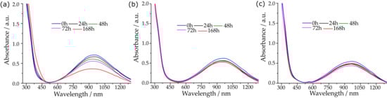 UV/Vis/NIR absorption spectra of V15 solutions at room temperature. The 1.0 mM solutions were incubated for 24, 48, 72, and 168 h: (a) in water; (b) in enzymatic medium; (c) in RPMI medium (pH 7.4).
