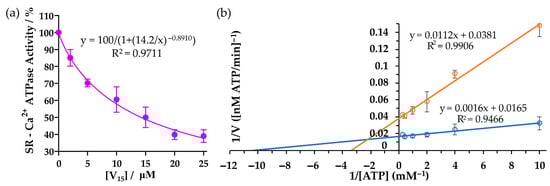 (a) Inhibition of Ca2+-ATPase activity. (b) Lineweaver-Burk plot of Ca2+-ATPase activity in the absence (blue) and in the presence (orange) of 15 µM de V15.