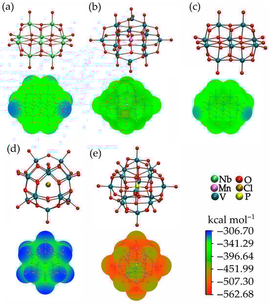 Ball and stick structures and ESP map of the anions (a) [Nb10O28]6− (Nb10) (b) [MnV13O38]7− (MnV13) (c) [V10O28]6− (V10) (d) [Cl@VV7VIV8O36]6− (V15) (e) [VV14O38(PO4)]9− (PV14 ox).