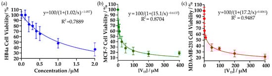 Evaluation of the cytotoxic effect on (a) HB4a, (b) MCF-7, and (c) MDA-MB-231 cell lines at different concentrations of V15 at 24 h. The graphs show the dose–response inhibition (IC50 determination) for all the cell lines, with the R-squared and linear curve fitting.