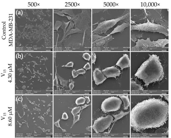 SEM analysis was performed on the MDA-MB-231 cell line at the same concentrations as those used in the Wound Healing assay (4.30 and 8.60 µM). The SEM images showed cells with a fusiform shape, characteristic of this mesenchymal subtype of triple-negative cell line (Figure 8a), which changed to a more epithelial-like (amoeboid) morphology (Figure 8b,c). This morphology is generally related to a lower migratory capacity, which corroborates the cell migration assays. Finally, the microvesicles that appeared after treatment with the highest dose of V15 might be associated with the beginning of the cell death process. These morphological changes in the cells may be related to interactions with the cytoskeleton and possibly with the actin [65].