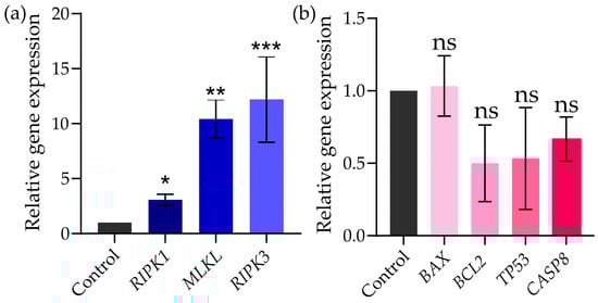 Evaluation of relative gene expression in the MDA-MB-231 line treated with 17.2 µM of V15 for 48 h. (a) Relative necroptosis gene expression and (b) relative apoptosis gene expression, compared to the constitutive gene GAPDH. The statistical treatment is compared to the control, ns (non-significant), * p < 0.01; ** p < 0.001; *** p < 0.0001.