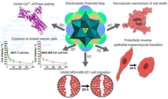 Calcium ions are universal secondary messengers that play a vital role in the functioning of mitochondrial processes such as adenosine triphosphate (ATP) production, reactive oxygen species (ROS) generation, and apoptosis [3]. An imbalance in Ca2+ levels is associated with several diseases, including cancer, diabetes, Parkinson’s disease, and Alzheimer’s disease [4,5,6]. The Ca2+-ATPase of the sarcoplasmic reticulum, found in muscle, is a transmembrane ion transporter. It is one of the most representative enzymes belonging to the family of P-type ATPases involved in cytosolic Ca2+ homeostasis. This enzyme is vital for the proper functioning of cells, and in the specific case of Ca2+-ATPase, it regulates muscle contraction and relaxation [7]. Ca2+-ATPase inhibitors have been used as drugs for cardioprotection, immunosuppression, and antitumor agents. The latter effect occurs due to the increase in cytoplasmic Ca2+ levels, which consequently activates apoptotic factors, leading to cell death [8,9]. As previously described, these P-type ATPases were considered one of the potential targets for POMs, which are expected to develop into the next generation of anticancer drugs that selectively target cancer cells [10]. Moreover, the calcium homeostasis dysfunction, a well-known hallmark of cancer, has recently been reviewed for its role in chemoresistance [11].