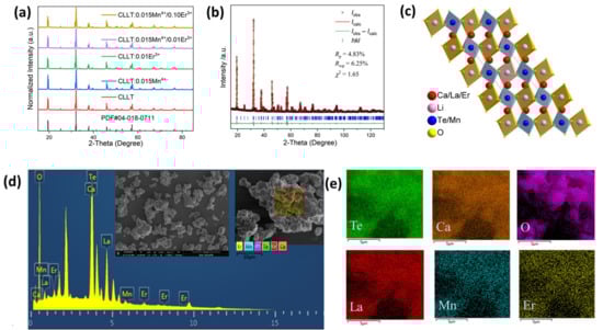 (a) XRD patterns of CLLT, CLLT:0.015Mn4+, CLLT:0.01Er3+, CLLT:0.015Mn4+/0.01Er3+, and CLLT:0.015Mn4+/0.10Er3+ phosphors compared to standard data for CaLaLiTeO6 (PDF # 04-018-0711); (b) Rietveld refinement results for CLLT:0.015Mn4+/0.01Er3+; (c) crystal structure of CLLT:0.015Mn4+/0.01Er3+; (d) EDX spectrum and representative SEM image (inset) of the sample particles. (e) Elemental mappings of CLLT:0.015Mn4+/0.01Er3+ phosphors.