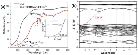 (a) The DR spectra of the CLLT host and CLLT:0.015Mn4+/0.01Er3+ phosphors, with the inset illustrating the optical band gaps; (b) calculated electronic band structure of the CLLT host.