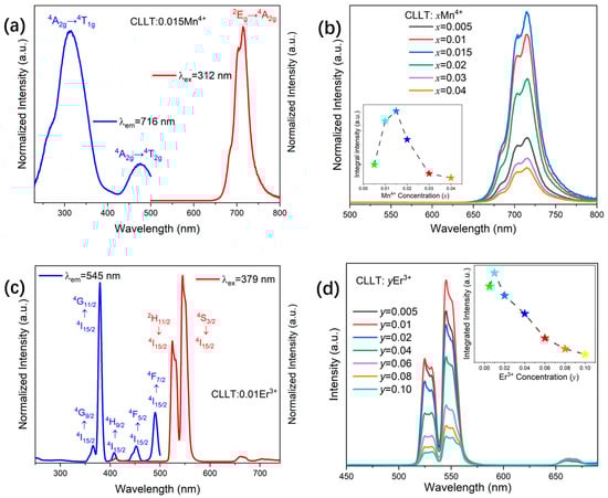 (a) PLE and PL spectra of CLLT:0.015Mn4+ phosphors; (b) the PL spectra of CLLT:xMn4+ phosphors under 312 nm excitation, with the inset displaying integrated intensity at varying Mn4+ concentrations x; (c) PLE and PL spectra of CLLT:0.01Er3+ phosphors; (d) the PL spectra of CLLT:yEr3+ phosphors under 379 nm excitation, with the inset displaying integrated intensity at varying Er3+ concentrations y.