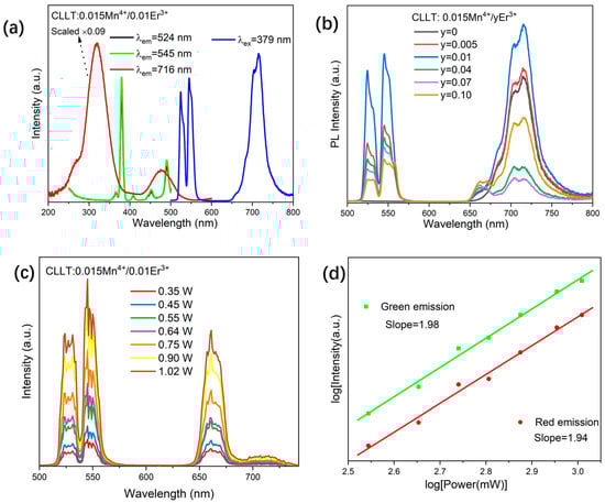 (a) PLE and PL spectra of CLLT:0.015Mn4+/0.01Er3+ phosphors; (b) PL spectra of the CLLT:0.015Mn4+/yEr3+ with different y concentrations (y = 0, 0.005, 0.01, 0.04, 0.07 and 0.10) under excitation of 379 nm; (c) PL spectra of CLLT:0.015Mn4+/0.01Er3+ phosphors under 980 nm excitation wavelength; (d) logarithmic plot versus pumping power.