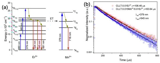 (a) Schematic energy level diagram of Er3+ and Mn4+ ions in the CLLT:0.015Mn4+/0.01Er3+ phosphors; (b) decay curves of 545 nm emission from CLLT:0.01Er3+ and CLLT:0.015Mn4+/0.01Er3+ phosphors under 379 nm excitation.