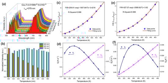 (a) Temperature-dependent PL spectra of CLLT:0.015Mn4+/0.01Er3+ in the range of 303 to 463 K; (b) integrated PL intensity at various temperatures; (c) changes in the FIR (I524nm/I545nm) values with temperature; (d) relative sensitivity (Sr, left) and absolute sensitivity (Sa, right) corresponding to FIR (I524nm/I545nm); (e) variation of the FIR (I716nm/I545nm) values with temperature; (f) relative sensitivity (Sr, left) and absolute sensitivity (Sa, right) corresponding to FIR (I716nm/I545nm).