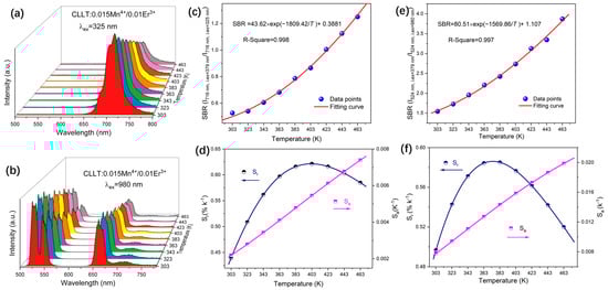 (a) Temperature-dependent PL spectra of CLLT:0.015Mn4+/0.01Er3+ excited at 325 nm (center of the excitation band); (b) temperature-dependent upconversion PL spectra of CLLT:0.015Mn4+/0.01Er3+ (λex = 980 nm); (c) SBR (I716nm,λex=379nm/I716nm,λex=325nm) values along with the fitted curves; (d) relative sensitivity (Sr, left) and absolute sensitivity (Sa, right) corresponding to SBR (I716nm,λex=379nm/I716nm,λex=325nm); (e) SBR (I524nm,λex=379nm/I524nm,λex=980nm) values and the fitted curves; (f) relative sensitivity (Sr, left) and absolute sensitivity (Sa, right) corresponding to SBR (I524nm,λex=379nm/I524nm,λex=980nm).