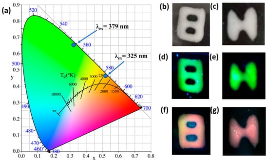 Drawing inspiration from the excitation-sensitive PL properties of CLLT:0.015Mn4+/0.01Er3+ phosphor, we conducted an investigation into its possible application in sophisticated optical anti-counterfeiting. The CIE color coordinates corresponding to the sample CLLT:0.015Mn4+/0.01Er3+ under 325 nm and 379 nm light sources are shown in Figure 8a, demonstrating emission of orange-red and bright yellow-green light. The distinct emission colors of this luminescent material allow for easy differentiation by both human observers and cameras. In Figure 8b–g, luminescence images of the letter “H” and the number “8” patterns under various excitation conditions at room temperature are displayed. Under normal lighting, the anti-counterfeiting patterns appear milky white. However, when excited by 379 nm light, the patterns emit a vibrant yellow-green luminescence. Particularly noteworthy is the shift in emission color to orange-red when excited at 325 nm, primarily attributed to Mn4+ luminescence. This outcome underscores the remarkable ability of CLLT:0.015Mn4+/0.01Er3+ phosphor to dynamically adjust its emitted color through adjustable excitation wavelengths, presenting significant benefits for anti-counterfeiting applications.