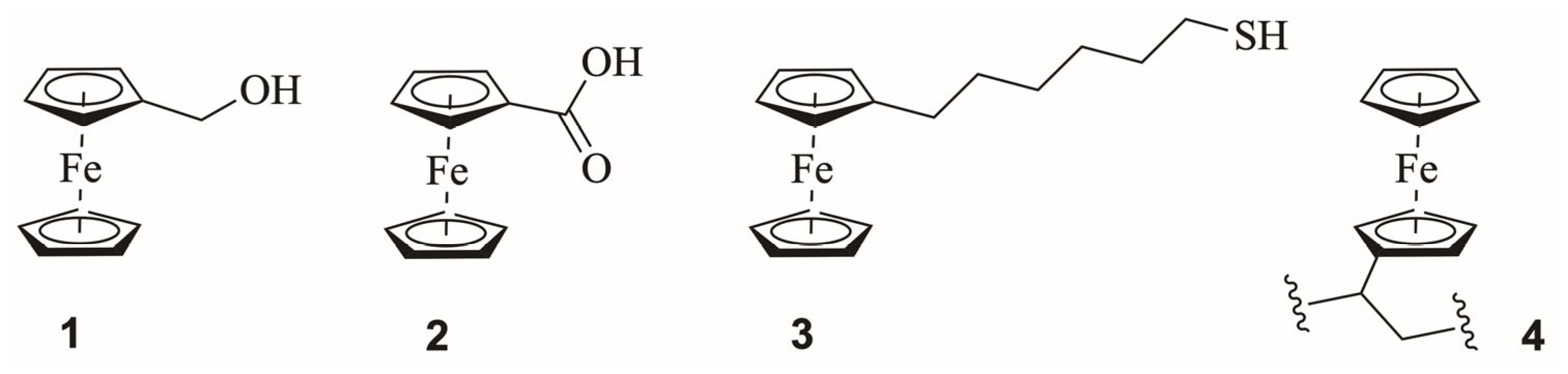 - Saleem, M.; Yu, H.; Wang, L.; Zain-ul-Abdin; Khalid, H.; Akram, M.; Abbasi, N.M.; Huang, J. Review on synthesis of ferrocene-based redox polymers and derivatives and their application in glucose sensing. Anal. Chim. Acta 2015, 876, 9–25. [Google Scholar] [CrossRef]