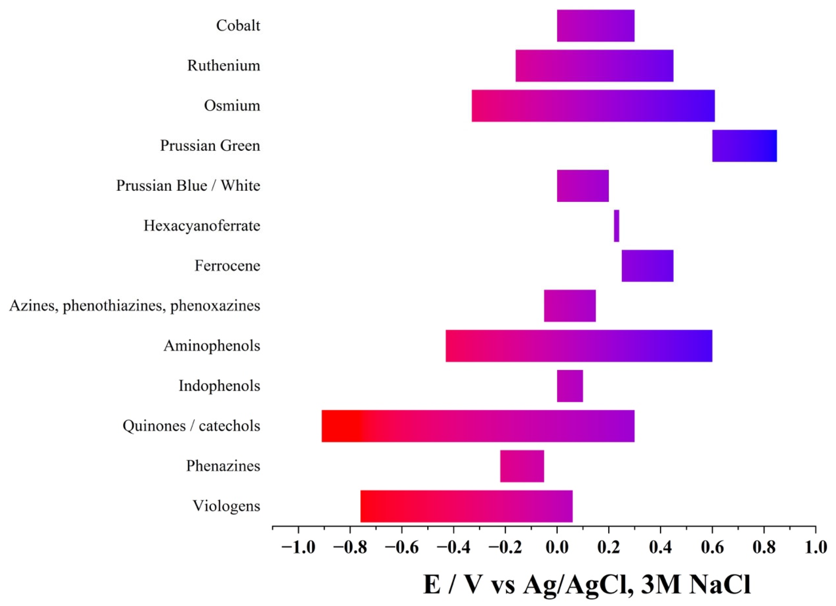 - Chemical reversibility: structural and chemical integrity of the mediator during continuous redox cycling without decomposition, dimerisation, ligand loss, or adsorption.