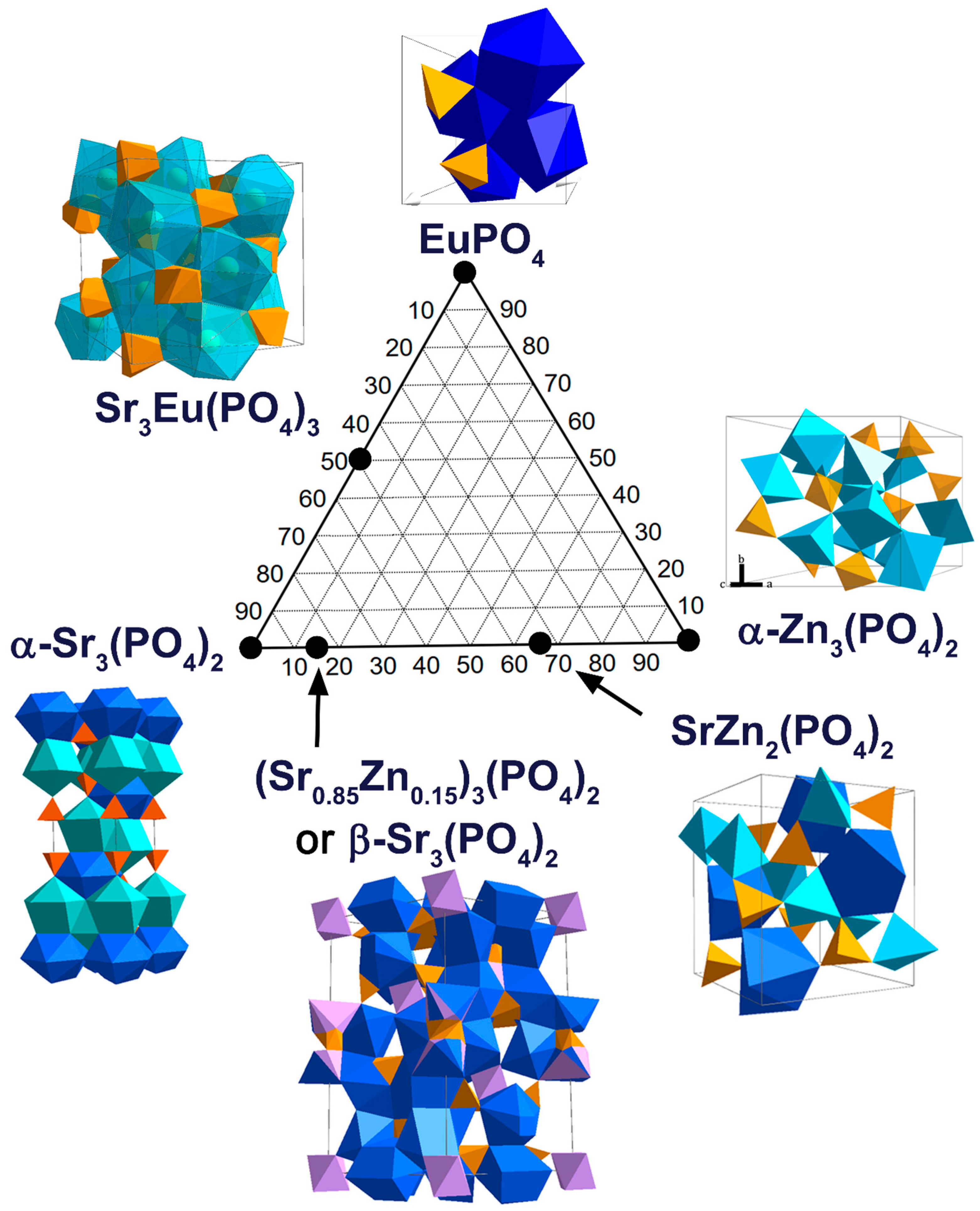 | Sr2+ → Zn2+, Eu3+ | Sr3–xZnxEu(PO4)3 | 0 ≤ x ≤ 2.0 |
