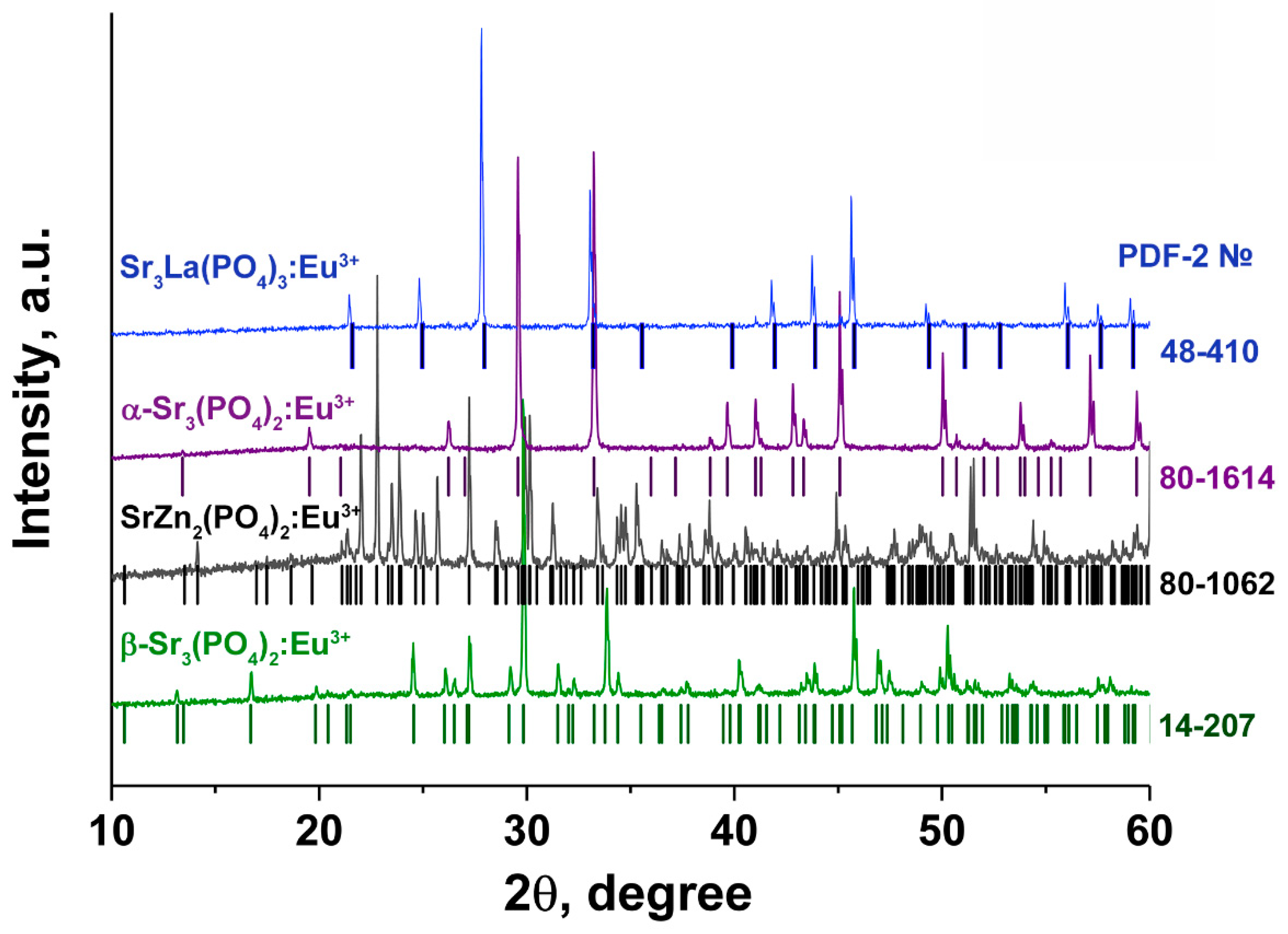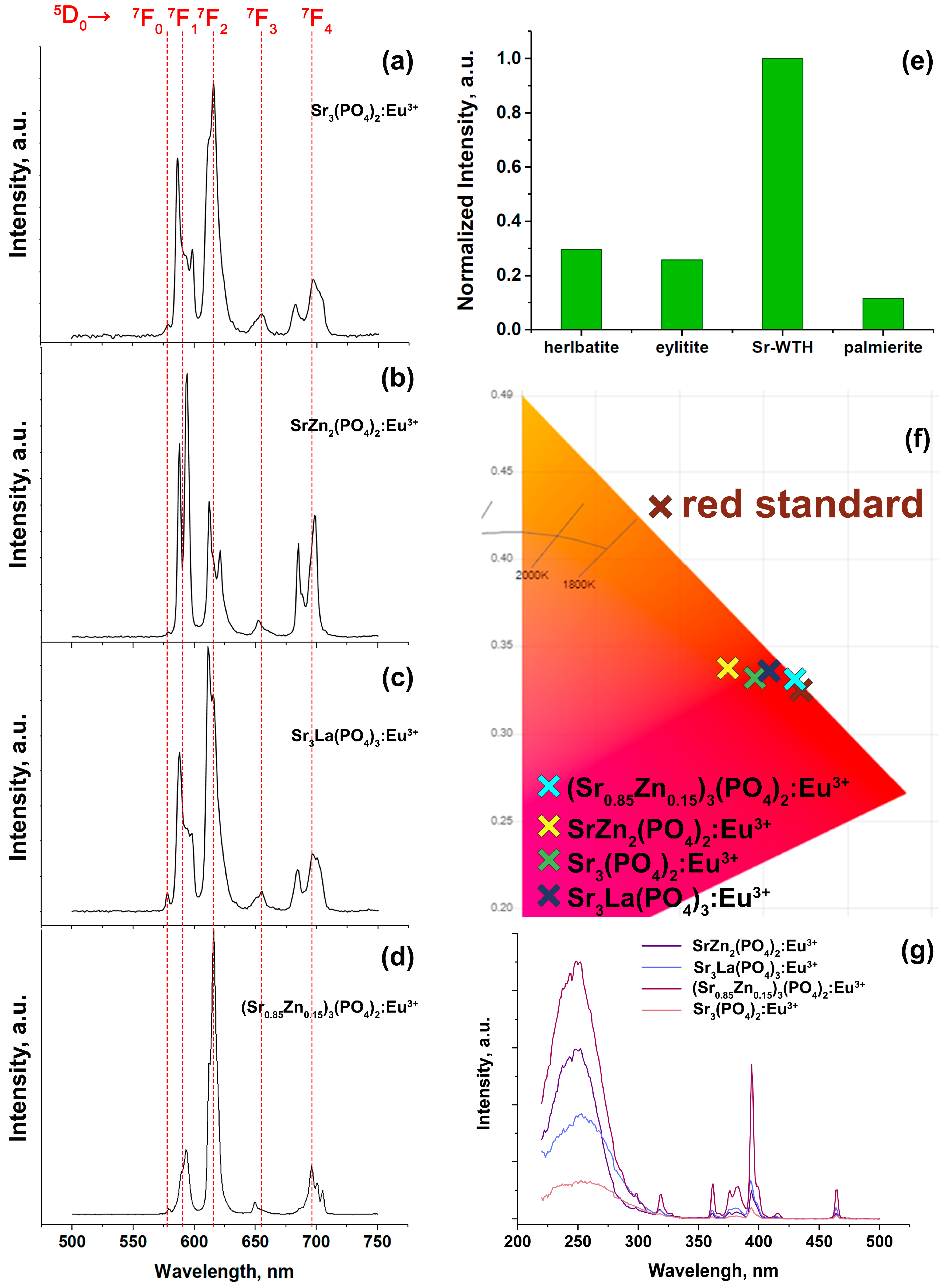 | Sr3(PO4)2:Eu3+ | SrZn2(PO4)2:Eu3+ | Sr3La(PO4)3:Eu3+ | (Sr0.85Zn0.15)3(PO4)2:Eu3+ | |