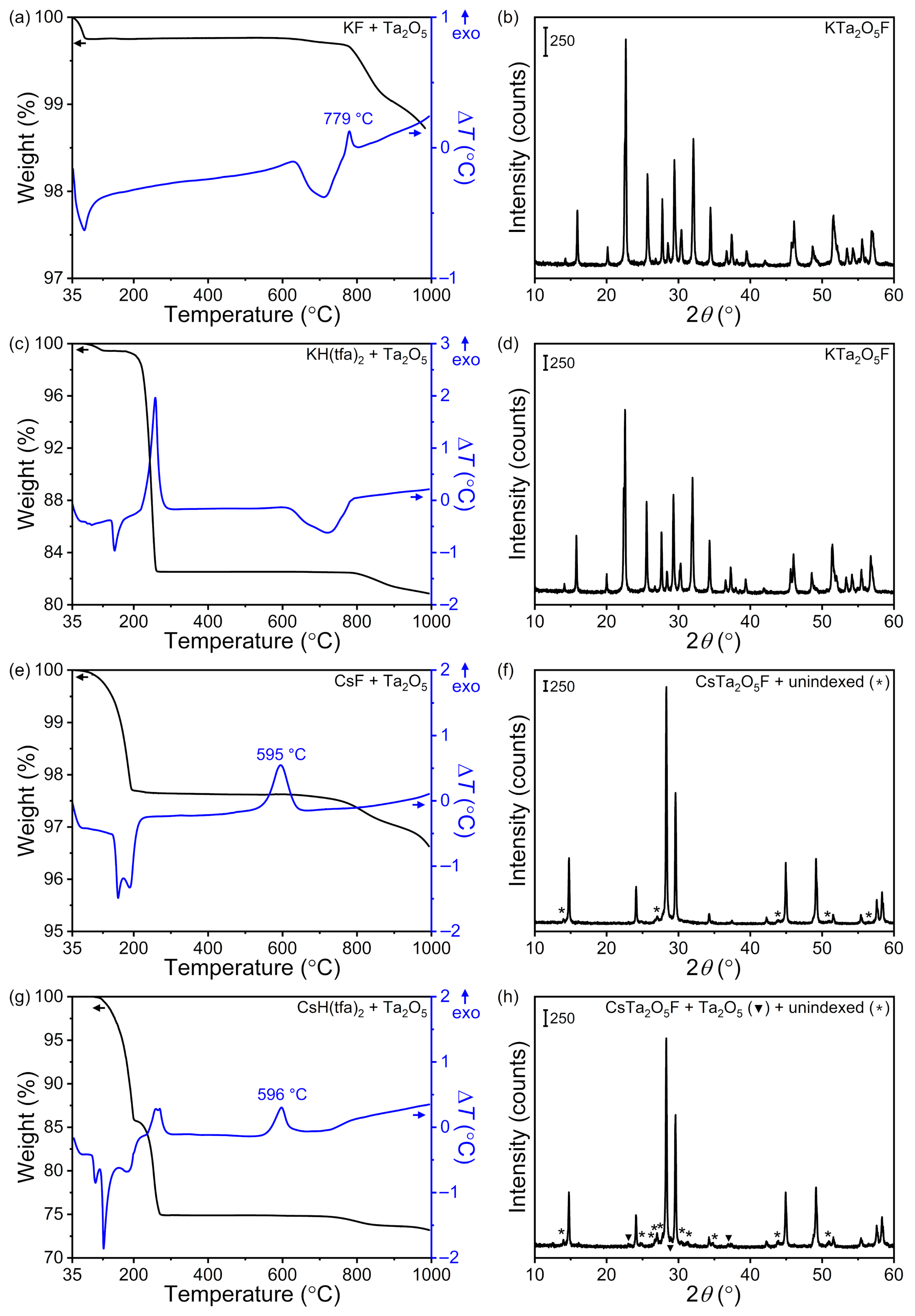 Thermal Analysis (TGA–DTA). Thermogravimetric (TGA) and differential thermal (DTA) analyses of reaction mixtures KF + Ta2O5, KH(tfa)2 + Ta2O5, CsF + Ta2O5, and CsH(tfa)2 + Ta2O5 were conducted under dry synthetic air (100 mL min−1) using a TGA–DTA analyzer (SDT2960, TA Instruments, New Castle, DE, USA). ≈35–65 mg of sample were placed in an alumina crucible, held at 35 °C for 10 min, and then ramped to 1000 °C at a rate of 10 °C min−1. Heating was stopped once the temperature reached 1000 °C and samples were allowed to cool to room temperature.