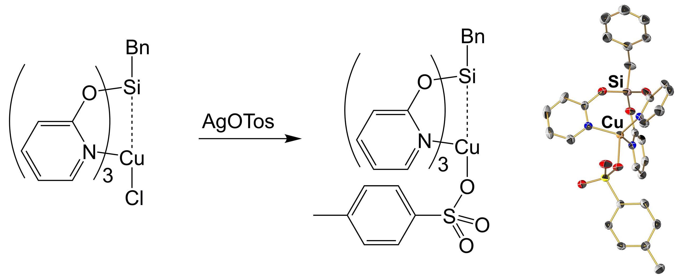 Under the conditions applied (moderately polar solvents such as chloroform and THF, room temperature), the Si–C bond of benzylsilane BnSi(pyO)3 (L) resists cleavage and transfer to an electrophile (benzaldehyde), both in the absence and presence of CuCl. Instead, in the former case, in a dynamic equilibrium the aldehyde group undergoes addition of the Si-bound pyridine-2-olate with binding of the pyridine N-atom to the carbonyl C atom and formation of an Si–O bond to the alcoholate thus formed. In the latter case, the formation of complexes such as LCuCl (in chloroform) and LCuClCuCl (in THF and in the presence of excess CuCl) is preferred. Also, replacing chloride by tosylate (formation of complex LCuOTos upon treating LCuCl with AgOTos) did not lead to Si–C cleavage in the presence of benzaldehyde. Nonetheless, in LCuClCuCl and LCuOTos the Cu atoms are closer to Si than in the parent complex LCuCl, which may indicate at a potential way of activating the trans-disposed Si–C bond. In contrast to the copper(I) complexes, silver(I) is a less favored electrophile in the tripodal ligand L. LAgOTos was obtained from the reaction of L and AgOTos, but treatment with chloride (Et4NCl) caused precipitation of AgCl with liberation of L. Moreover, solution NMR spectroscopic investigations of LCuOTos and LAgOTos showed that the latter is more prone to changing the metal coordination sphere in solution. In the solid complexes LCuOTos and LAgOTos, however, Cu(I) and Ag(I) approach the Si atom in a similar manner, i.e., establishing contacts which are markedly shorter than the sum of the van der Waals radii (88% and 87%, respectively). In addition to yielding a new complex with very short nonbonding Si···Ag contact, the structural features of LAgOTos motivate us to include silver(I) complexes in future studies of Si–C bond activation.