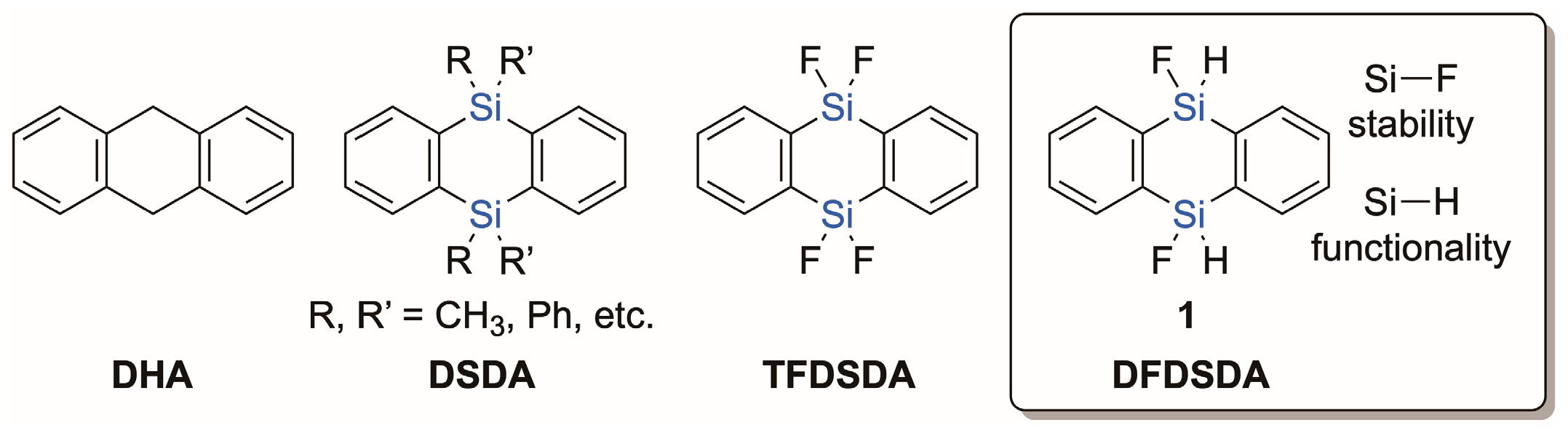 26] directly at these silicon bridgehead positions. In addition, as fluorine is structurally similar to hydrogen, possessing a relatively small van der Waals radius (F = 1.47 Å, H = 1.2 Å), the combination of high electronegativity and small size makes fluorination the gold standard for tuning molecular electronics and enhancing stability. Furthermore, the Si–F bond is thermodynamically robust, with an average energy of approximately 129 kcal/mol, which contributes directly to the resulting molecule’s increased oxidative, hydrolytic, and thermal stability. From these viewpoints, there have been much interest in the synthetic study of fluorine-substituted 9,10-disila-9,10-dihydroanthracene derivatives as potential smart materials. The synthesis of such F-substituted 9,10-disila-9,10-dihydroanthracense necessitates overcoming significant synthetic hurdles associated with organosilicon chemistry. While the Si–F bond is known to be thermodynamically very stable, the construction of this linkage, particularly in a site-selective manner within a 9,10-dihydroanthracene skeleton is not trivial. Silicon chemistry is fundamentally challenging due to the inherent difficulty in forming and the overall instability of unsaturated silicon systems, resulting in a diminished structural diversity compared to carbon analogues. Finally, the only synthetic example of 9,9,10,10-tetrafluoro-9,10-disila-9,10-dihydroanthracene (