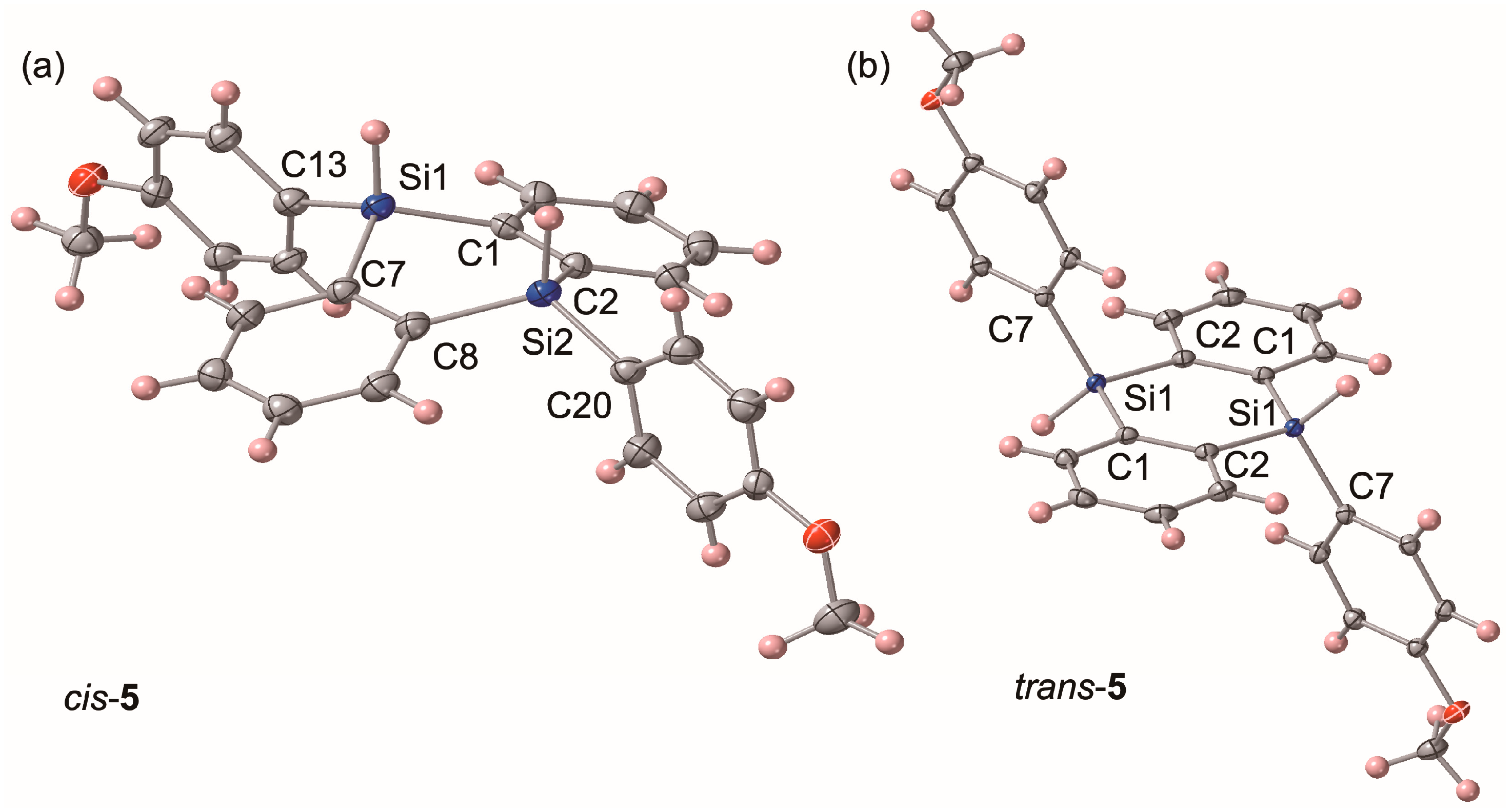2-Bromophenyl(p-methoxyphenyl)silane (4) (170 mg, 0.580 mmol) was dissolved in THF (10.0 mL) in a round flask in which magnesium (1.19 g, 49.0 mmol) was placed. The reaction mixture was stirred under reflux conditions for 3 h, and slowly warmed up to room temperature. All volatiles were removed under reduced pressure, and hexane was added. After all insoluble inorganic salts were removed by filtration through a pad of celite, the solvent was removed from the filtrate under reduced pressure to give 9,10-bis(p-methoxyphenyl)-9,10-disila-9,10-dihydroanthracenes (5) as an isomeric mixture of cis- and trans-isomers (cis-5:trans-5 = 3:10). The isomeric mixture was purified by column chromatography [hexane, benzene, SiO2] to afford the cis-isomer of 9,10-bis(p-methoxyphenyl)-9,10-disila-9,10-dihydroanthracene as colorless solids (3.5 mg, 8.2 μmol, 3%), and the trans-isomer of 9,10-bis(p-methoxyphenyl)-9,10-disila-9,10-dihydroanthracene as colorless solids (39.4 mg, 92.8 μmol, 32%). cis-5: colorless solids, Mp = 121–122 °C (decomp.). 1H NMR (400 MHz, C6D6) δ 3.24 (s, 6H), 5.80 (s, 2H), 6.73 (d, J = 8.6 Hz, 4H), 7.49 (d, J = 8.7 Hz, 4H), 7.72 (dd, J = 3.2, 5.4 Hz, 4H); 13C{1H} NMR (101 MHz, C6D6) δ 54.6 (CH3), 114.4 (CH), 124.6 (C), 129.2 (CH), 136.1 (CH), 138.0 (CH), 141.6 (C), 161.8 (C); 29Si{1H} NMR (119 MHz, C6D6) δ −30.8. trans-5: colorless solids, Mp = 128–129 °C (decomp.) 1H NMR (400 MHz, C6D6) δ 3.25 (s, 6H), 5.77 (s, 2H), 6.78 (d, J = 8.6 Hz, 4H), 7.17 (dd, J = 3.3, 3.3 Hz, 4H), 7.54 (d, J = 8.6 Hz, 4H), 7.74 (dd, J = 3.3, 5.4 Hz, 4H); 13C{1H} NMR (101 MHz, C6D6) δ54.6 (CH3), 114.5 (CH), 124.8 (C), 129.2 (CH), 136.1 (CH), 137.9 (CH), 141.7 (C), 161.8 (C); 29Si{1H} NMR (119 MHz, C6D6) δ −30.0; HRMS (DART), m/z: Found: 424.13305 ([M]+), Calcd. for C26H24O2Si2 ([M]+): 424.13148.