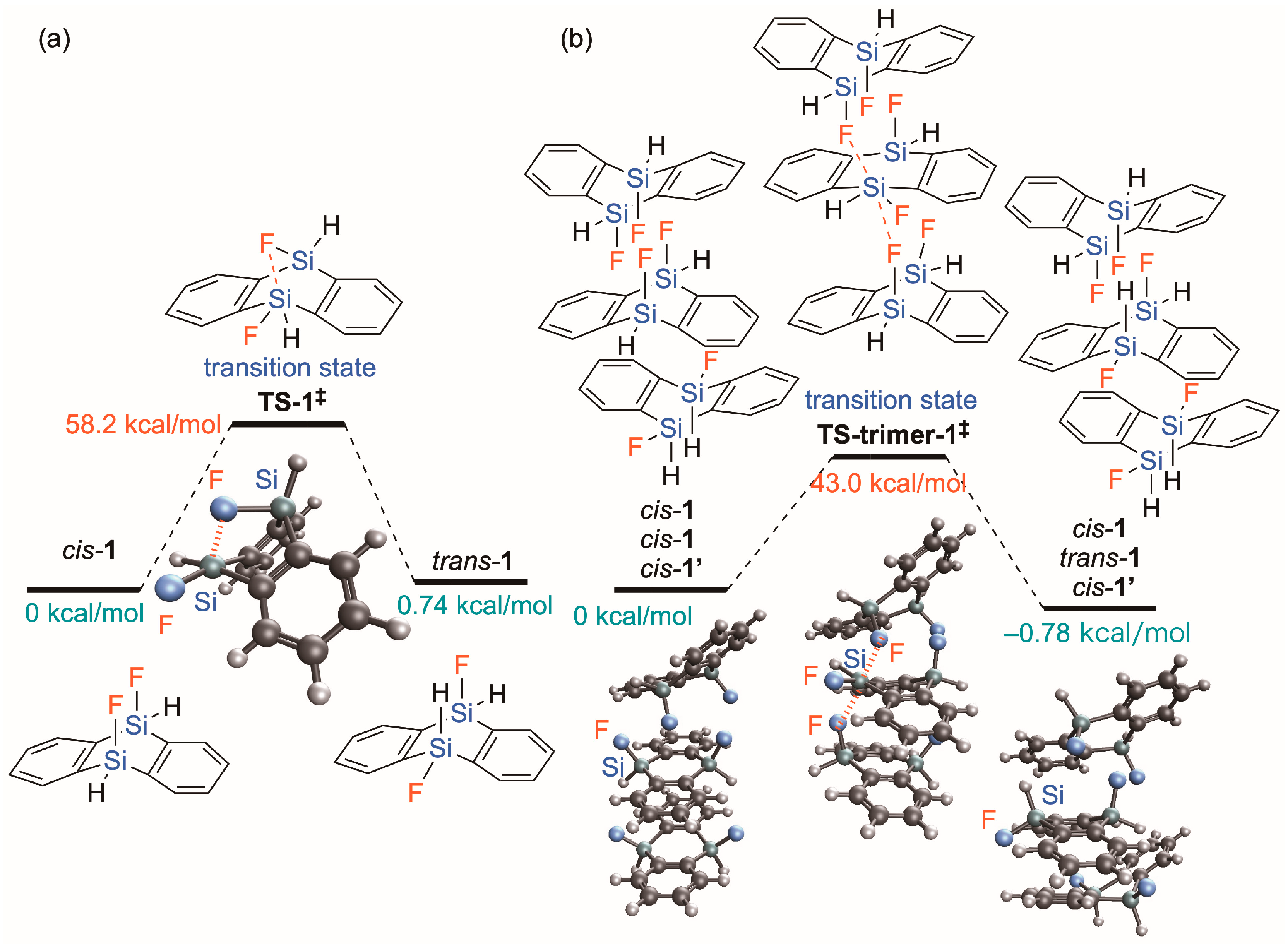 The trans-isomer of 9,10-bis(p-methoxyphenyl)-9,10-disila-9,10-dihydroanthracenes 5 (16.9 mg, 0.0398 mmol) was dissolved in C6D6 (0.60 mL) in a screw cap NMR tube. After adding an excess of HBF4·Et2O (0.05 mL, 0.364 mmol), the solution was stirred at room temperature for 1 min. All volatiles were removed under reduced pressure and hexane was added. All volatiles were slowly removed under reduced pressure to give 9,10-difluoro-9,10-disila-9,10-dihydroanthracenes (1) as an isomeric mixture (1a:1b = ca. 1:1) as colorless solids.